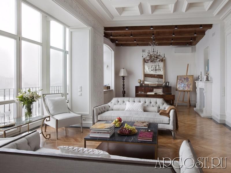 Прежде чем приступать к ремонту, усилили перекрытия. Затем последовал потолок: вернуть ушедшее ощущение тридцатых годов помогли оригинальные деревянные балки, которые долго скрывались за декоративными элементами. Вернули потолку первозданный рифленый вид — так старое дерево стало составной частью современного интерьера.