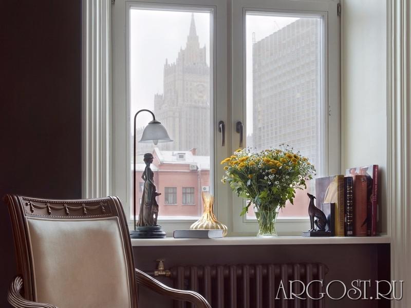 Вместо череды типовых комнат, которые выходили в общий коридор, сделали огромную гостиную с тремя панорамными окнами — привилегия, которой не было ни у простых советских граждан, ни у партийной элиты. Центральную зону новой комнаты отвели под гостиную, боковые — под кабинет и столовую соответственно. Со стороны кабинета появился искусственный камин, со стороны столовой — небольшой обеденный стол. На равном удалении от всех помещений поместили белую тумбу-шкаф с встроенным телевизором.